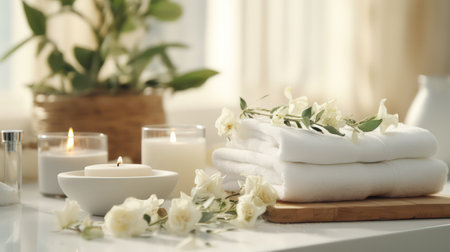 This serene spa scene features soft candles, fresh flowers, and cozy towels, creating a tranquil ambiance perfect for relaxation and rejuvenation. Ideal for wellness concepts.