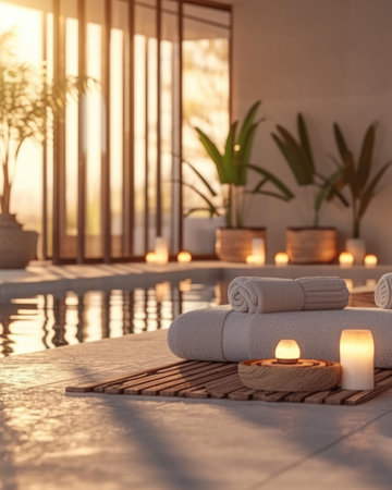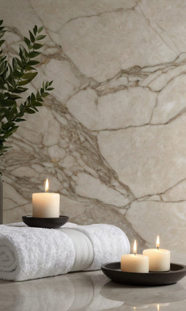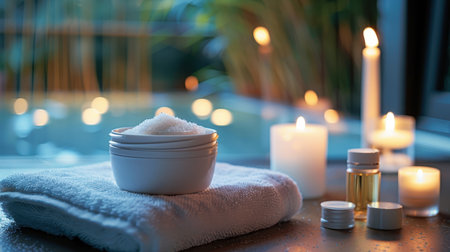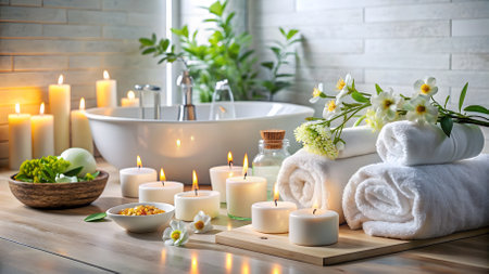 A tranquil spa composition with lit candles, plush towels, and aromatic oils.