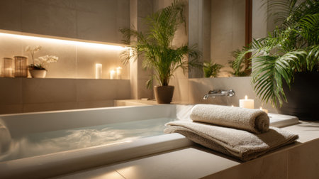 A tranquil bathroom features a large tub filled with water and soft towels neatly placed nearby. Soft lighting and plants create a peaceful environment perfect for relaxation.