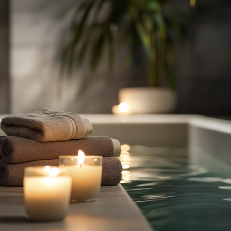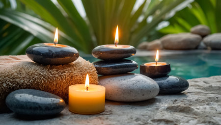 Spa relaxation with candles. Soft towels and lit candles create a tranquil atmosphere beside a spa pool.
