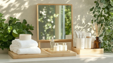A luxurious spa vanity setup with a mirror, aromatherapy oils, and fresh white towels.