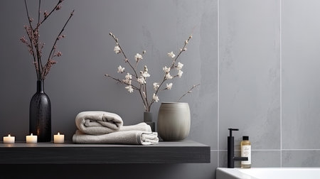 Spa and wellness concept. Bathroom interior with towels, candles and flowers