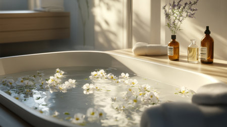 Peaceful bath scene with lavender-scented water, floating flowers, and essential oils
