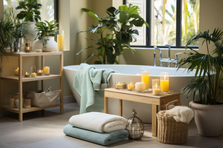 Peaceful spa-inspired bathroom with natural light and elegant decor. That the image is generated using AI.