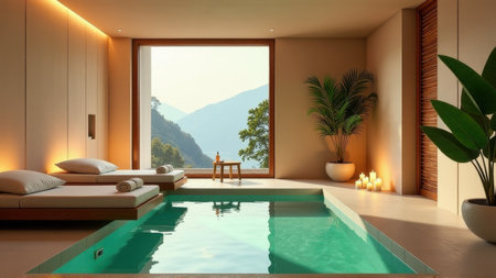 Luxury Indoor Pool and Spa with Mountain View., generative Ai
