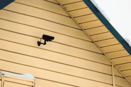 Yellow security camera sticker. Painted wooden facade. Procedures and compliance with regulations