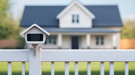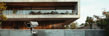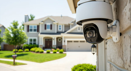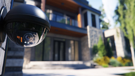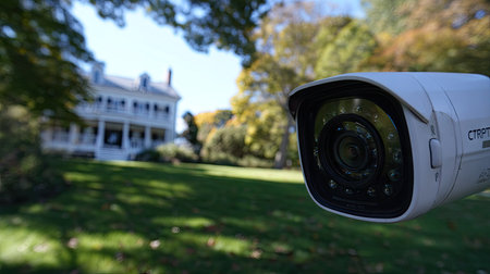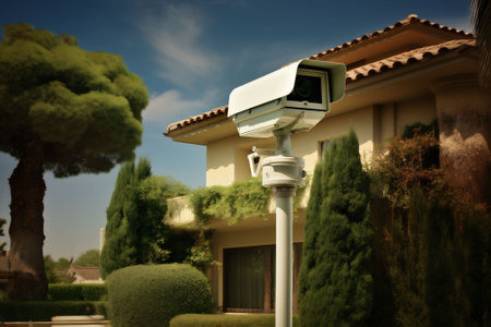 Modern surveillance camera mounted on wall overlooking peaceful neighborhood street with luxury house, green landscaping, ideal for security concepts