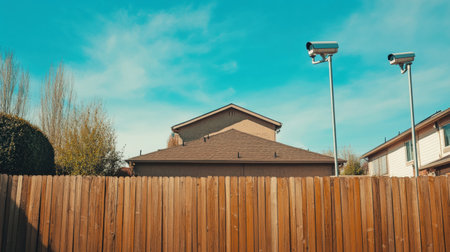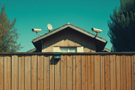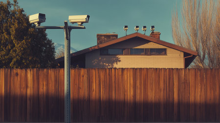 A house stands behind a tall wooden fence, equipped with multiple surveillance cameras, creating a sense of security and privacy.