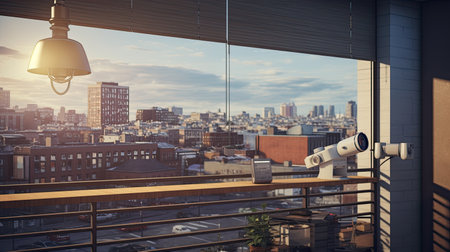 the urban landscape with a realistic photo of a CCTV camera overlooking the city skyline, symbolizing surveillance and security in modern cities