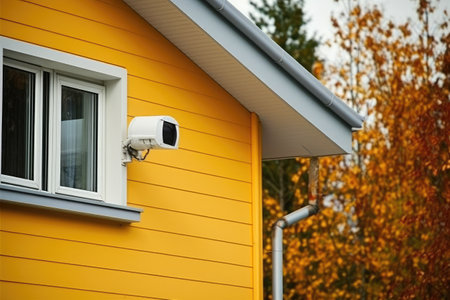 Security camera mounted on house wall for outdoor surveillance, background, AI generated