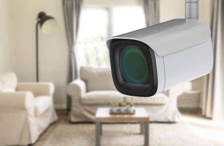 Indoor smart security camera mounted on wall in modern living room for advanced home surveillance system. concept of home safety, surveillance technology, modern interior.