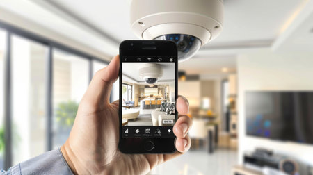 A homeowner adjusting settings on a home security camera system via a smartphone app, customizing surveillance preferences.