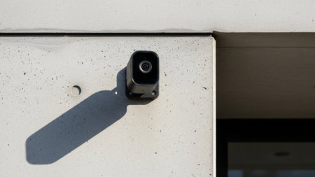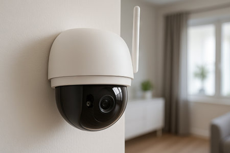 A color photo of an AI-powered security camera mounted on a wall, ensuring constant surveillance and protection. The sleek design and advanced technology highlight its efficiency in monitoring spaces. Copy space is present