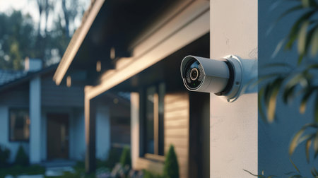 A modern security camera is mounted on the exterior wall of a home, facing towards the front yard. The camera is positioned to capture a wide view of the surrounding area, providing enhanced security for the property.