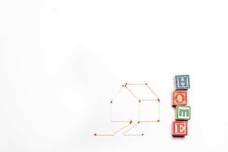 House made of matchsticks on an isolated white background with the word 'home' written in blocks alongside