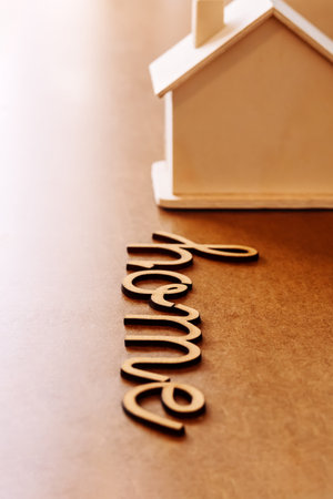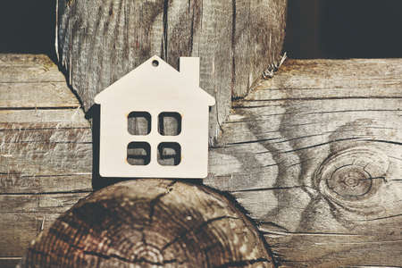 Wooden house sign on a rustic surface, inviting thoughts of family, real estate, or homely vibes with its natural texture