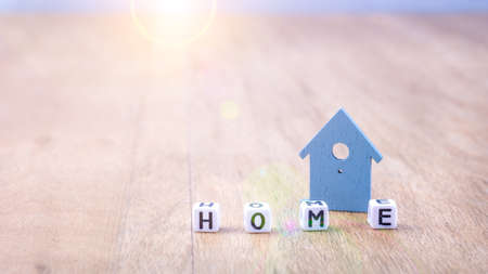 Alphabet wooden block in Home word and mock house toy. Concept of realestate housing sale. Business object with bokeh and light effect.