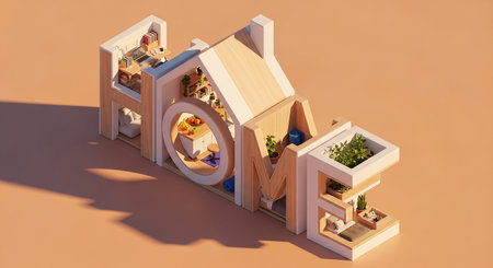 The word HOME is ingeniously rendered as a 3D architectural model, integrating various interior and exterior The distinct sections representing different functional areas, including a home office with a desk and laptop, a kitchen area with fruit, and a small garden space with plants. The use of natural wood and clean white structures creates a modern and inviting aesthetic, showcasing a blend of living, working, and green spaces within a cohesive conceptual