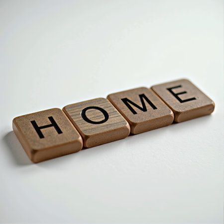 Alphabet wood blocks toys arranged as small houses in a row with text : HOME