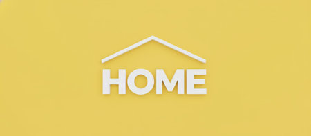 White 3d letters spelling home with a simple white roof symbol above them, set on a bright yellow background, representing housing, property, and real estate concepts