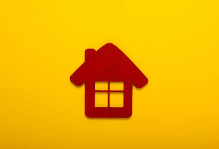 Empty blank wooden house on red background. Buying and selling real estate. Housing, realtor services. Renovation and home improvement. Short and long term rentals. Mortgage loan. Building maintenance