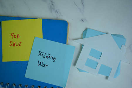 For Sale and Bidding War write on sticky notes isolated on Wooden Table.