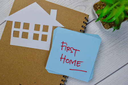 A wooden cube with the letter the word HOME with the miniature white home background. The conceptual image of first home and saving for buy home.