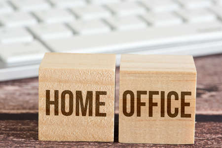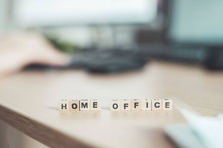 “Home Office†letters in foreground, man working in home office in blurry background