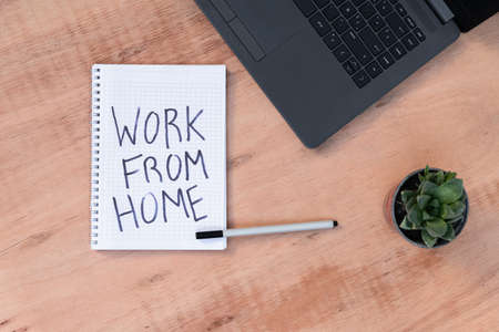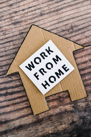 work from home sign with house icon made of cardboard over wooden background, concept of digital nomads working remotely or wfh days during lockdowns or covid-19 isolation