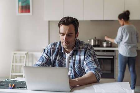 Young freelancer man working at home with computer and documents sitting at the table in the kitchen on the background of his wife who prepares food