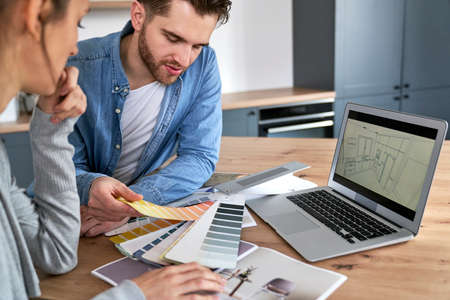 Caucasian couple sitting in kitchen and choosing colors for new flat