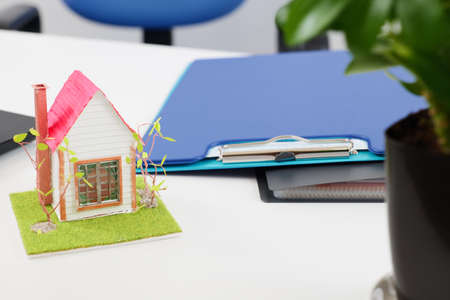 Real estate business idea on a desk with a small house and laptop in the office.