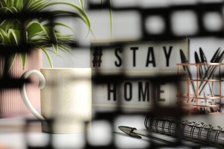 Home office desc concept during self quarantine as preventive measure against virus. Stay safe concept. Cup of coffee, clock, stationary, home plant on white background viie via soft focus net