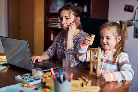 Woman mother working doing her job remotely during video chat call stream online course webinar on laptop from home while her daughter playing with bricks toy. Woman sitting at desk in front of computer looking at screen
