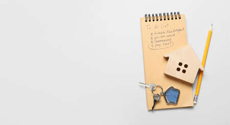Notepad with to do list, pencil, figure of house and key with keychain on light background