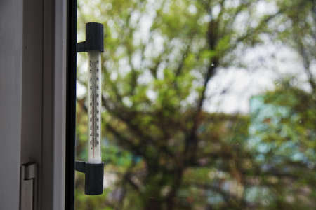 a thermometer of temperature outside the window that hangs on the window in the house