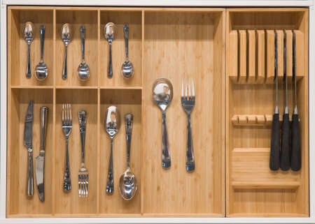 cutlery laid out in a wooden box in the kitchen, forks, spoons and knives.