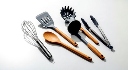Various kitchen utensils including spatulas, whiskeys, and small pots are neatly arranged on a white background, providing a clean layout.