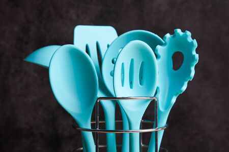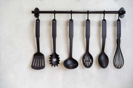 Studio photo of black plastic kitchen utensils, on the dark table.