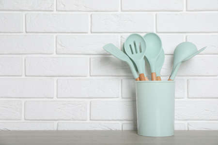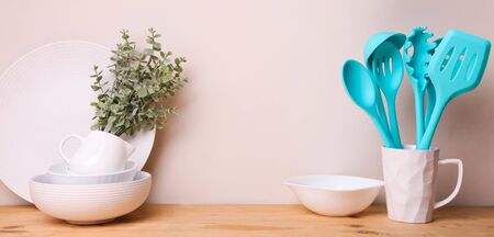 Kitchenware and utensils on a white shelf or counter. Banner with a white wall background and copy space. Kitchen cooking decor.
