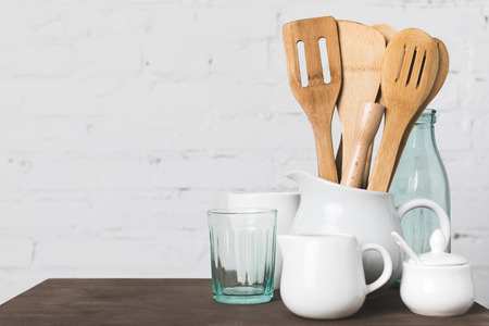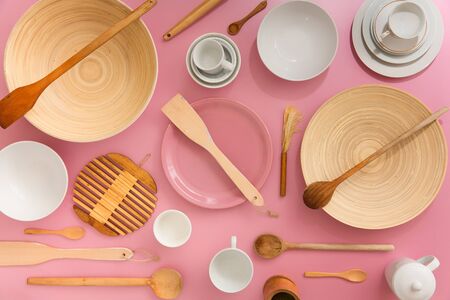 Closeup of eco-friendly kitchenware on ceramic surface. Home comfort and decor. Organizational space in kitchen. Set of crockery. Bamboo equipment for kitchen