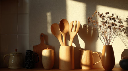 A serene kitchen scene showcasing wooden cooking utensils and dried flowers bathed in soft sunlight. The warm tones create a cozy ambiance, highlighting simplicity and elegance.