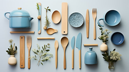 a variety of cooking utensils in a flatlay, with seamless and modern backgrounds, created with generative ai
