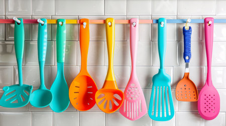 High-angle view of a colorful set of silicone kitchen utensils hanging on hooks against a tiled backsplash