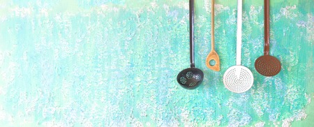Accessories for cooking hang on a metal holder in the kitchen: spatula, colander, whisk, ladle