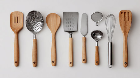 A carefully arranged flat lay of kitchen utensils features spatulas, whiskeys, and spoons on a white background, offering ample space for text.