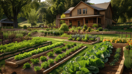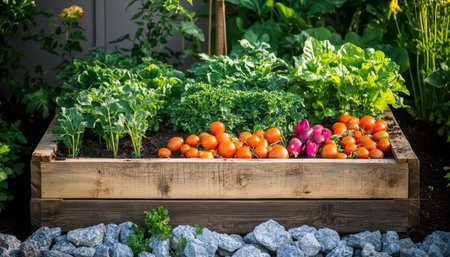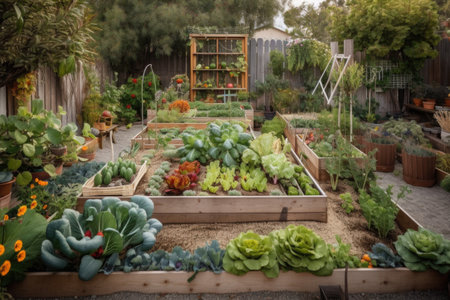 raised beds filled with abundant, diverse vegetables, created with generative ai