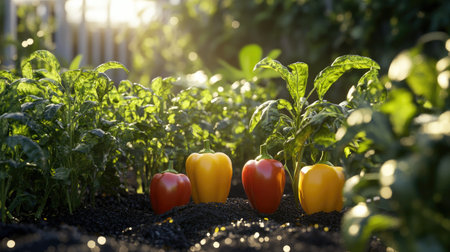 Discover a picturesque scene featuring vibrant bell peppers nestled among lush spinach plants, illuminated by warm sunlight in a thriving garden ecosystem.
