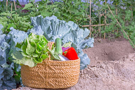 closeup of a wicker basket with fresh organic vegetables with a urban vegetable garden on the background