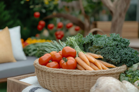 Tomatoes, carrots, and kale overflowing a wicker basket, celebrating a bountiful harvest from the garden